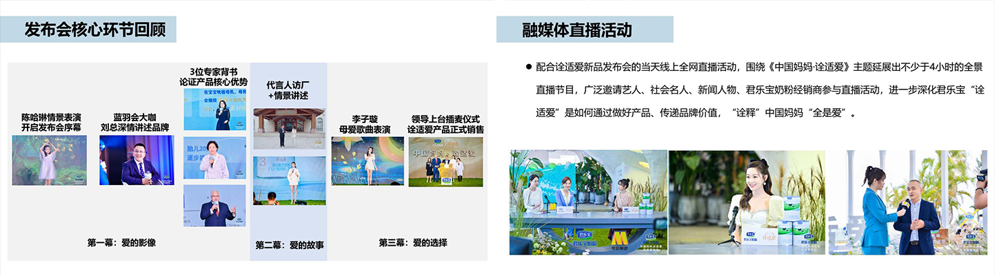 君樂寶奶粉全新推出高端產(chǎn)品——30%小分子蛋白的詮適愛奶粉,并簽約袁詠儀為品牌代言人。將以詮適愛新品發(fā)布會(huì)為起點(diǎn),向消費(fèi)者介紹、展示全新的高端產(chǎn)品,并通過相關(guān)傳播,提升君樂寶奶粉在消費(fèi)者心中的站位;
